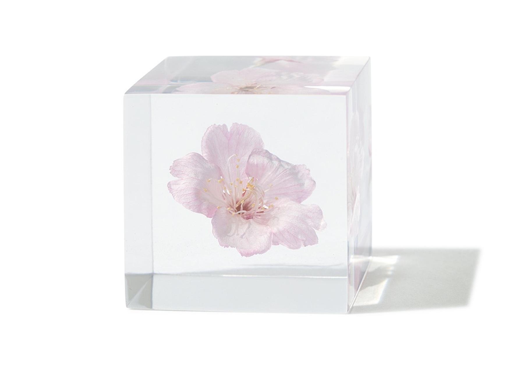 ソメイヨシノやカワヅザクラ、オオカンザクラなど、さまざまな品種の桜の花を閉じ込めた趣あるオブジェ。まるで浮いているように見える、神秘的な佇まいに目を奪われる。W40×D40×H40mm ¥7,700(ウサギノネドコ TEL. 075-366-8933)