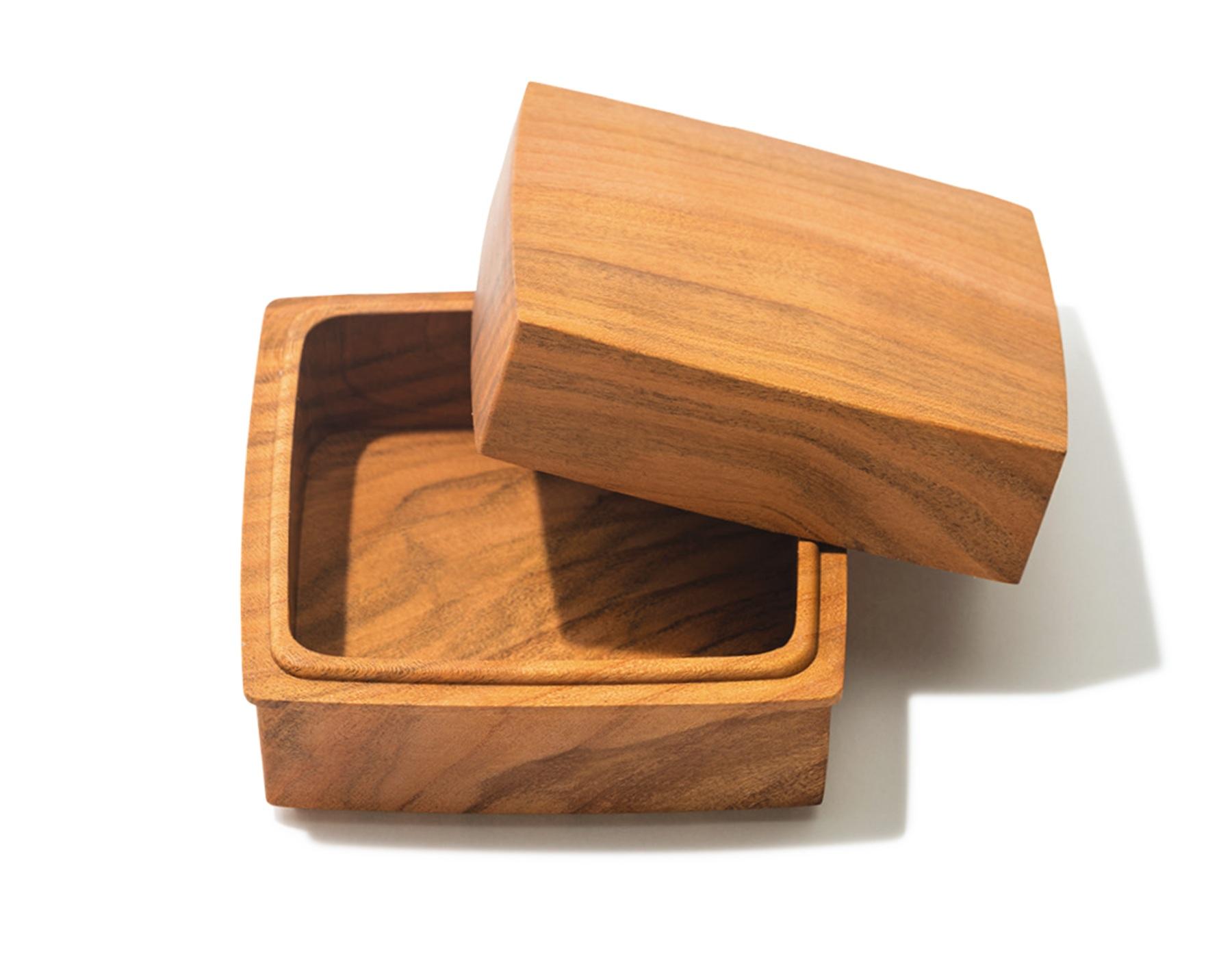 桜材を使ったケースは、少し赤みがかった優しい色合いや、なめらかな手触りが特徴的。切り方次第で国内外のさまざまなバターが収まり、冷蔵庫にそのまま入れられる。ハーフ W85×D85×H51mm ¥11,000(四十沢木材工芸 TEL. 0768-23-4077)