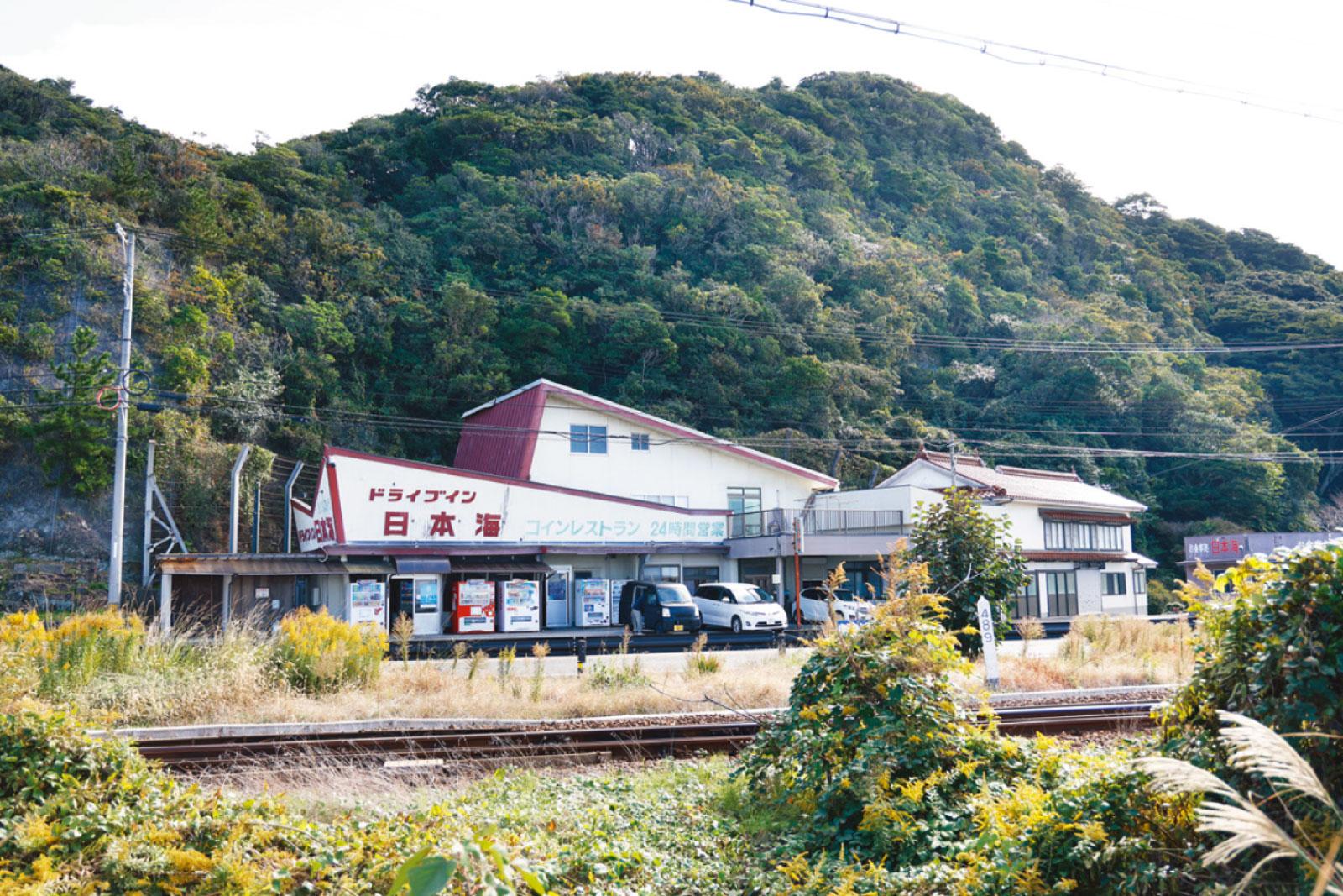 JR山陰本線折居駅の近く、国道沿いにあるドライブイン。昭和を感じる建物の中に入ると、自販機がズラリ!