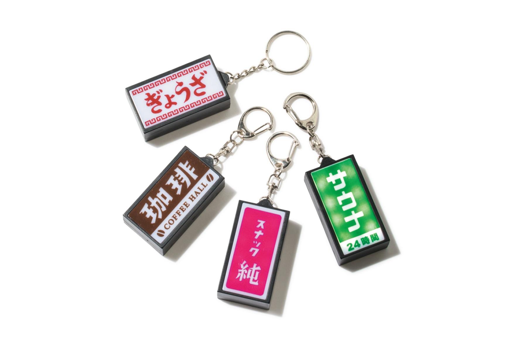 昔ながらの街の看板をイメージした手のひらサイズのキーホルダー。電池を入れてLEDライトを点灯させれば、よりノスタルジックなムードに。W5×D1.8×H2.8cm 各¥660(ニューレトロ/ハイタイド)
