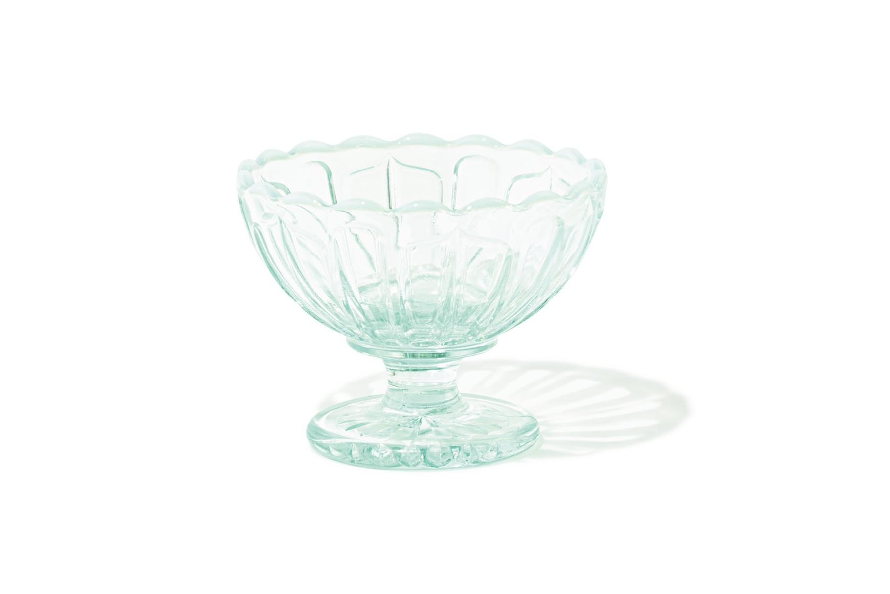 昭和の時代から引き継がれている金型で作られたフラッペグラスは、手作業であぶった乳白色の縁がポイント。市販のアイスクリームを盛るだけで、純喫茶風の懐かしい雰囲気に。φ10.6×H8.2cm ¥2,200(廣田硝子 hirota-g@hirota-glass.co.jp)