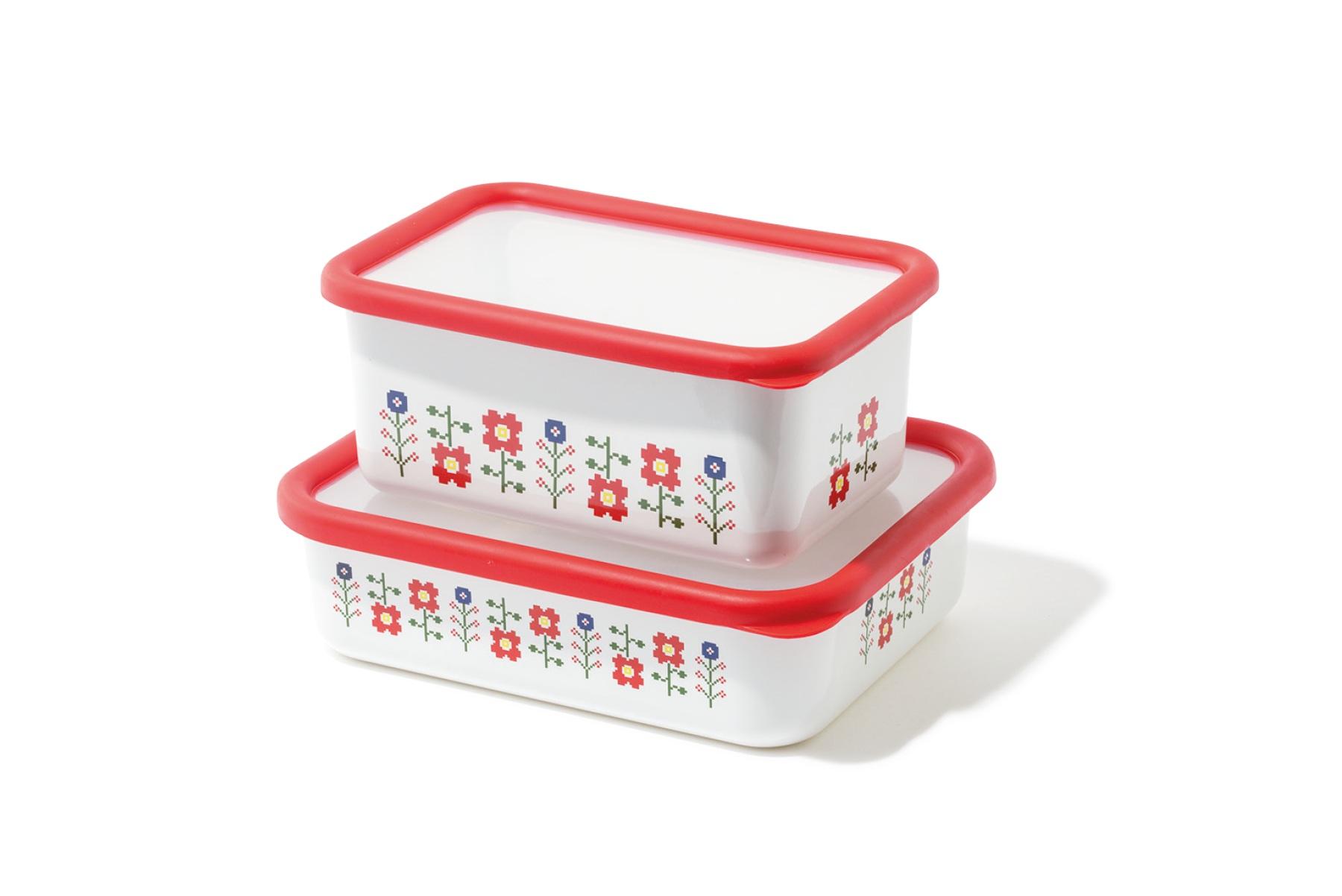 本体はオーブンディッシュとしても使用可能なコンテナ。表面がガラス質のホーローは酸や塩分に強く、ニオイも付きにくいため、料理の保存に最適。上・W17.5×D11.5×H7.5cm ¥2,420 下・W20×D16×H6cm ¥2,750(FUJIHORO TEL. 03-3851-7241)