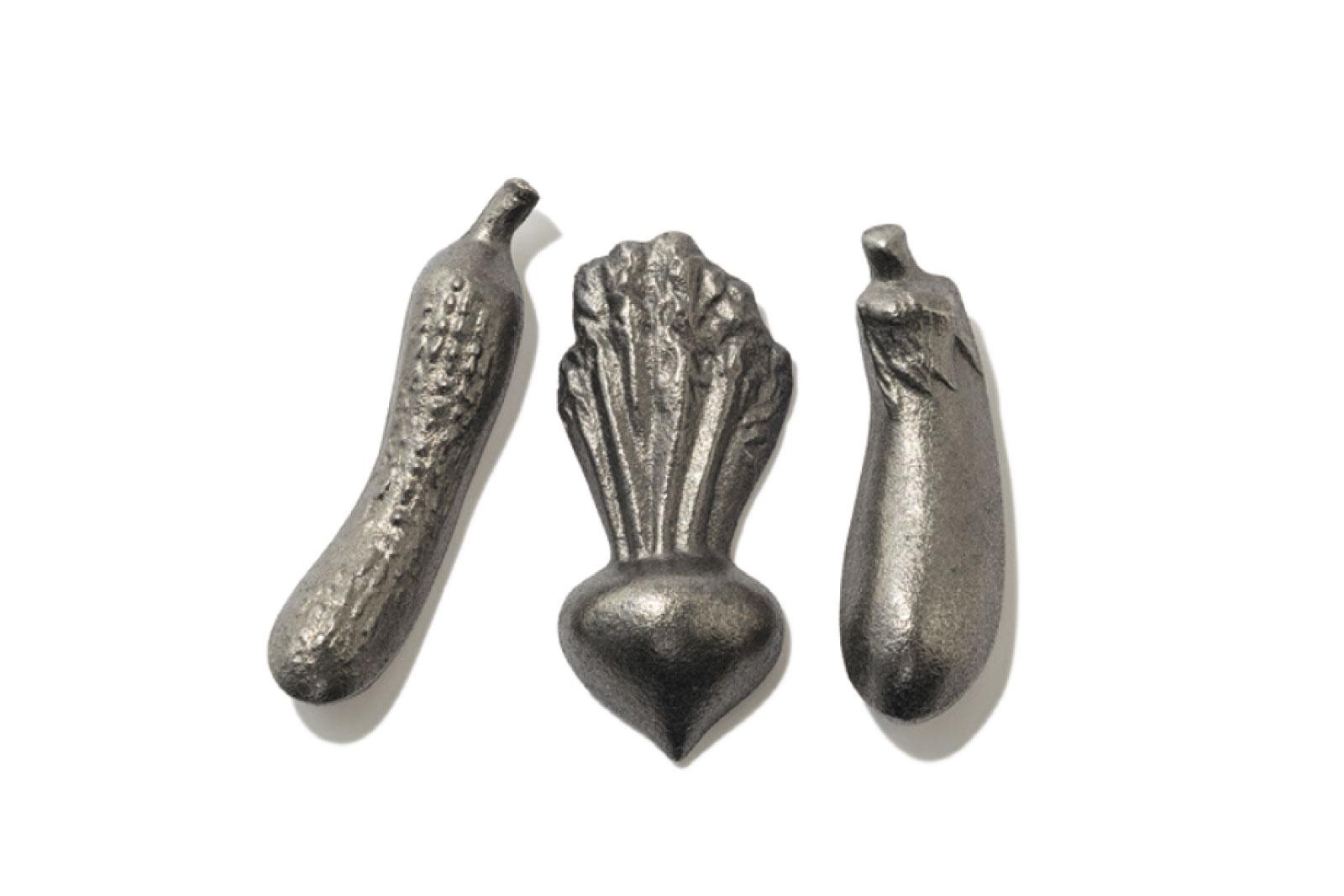 きゅうり、かぶ、なすの形をした鉄製の野菜型。金属イオンが素材の色素と結びつき、なす漬けや黒豆煮がきれいに仕上がる。やかんに入れてお湯を沸かせば、簡単に鉄分摂取も。3個セット ¥3,300(AKOMEYA TOKYO)