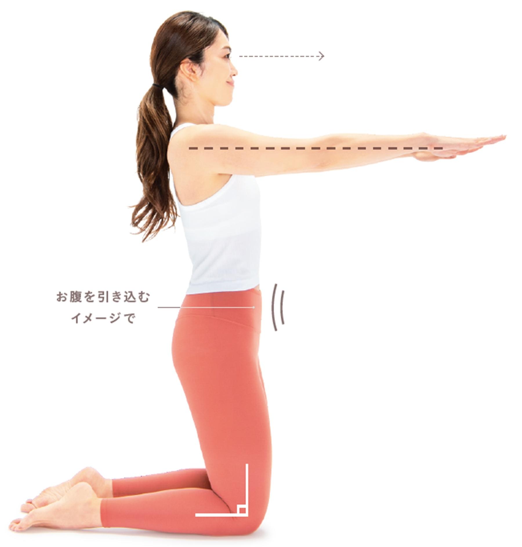 1、床に膝をつき、背筋を伸ばす。腕は床と平行に伸ばし、視線はまっすぐ前を見る。腰が反らないように、お腹を引き込むイメージで力を入れるのもポイント。