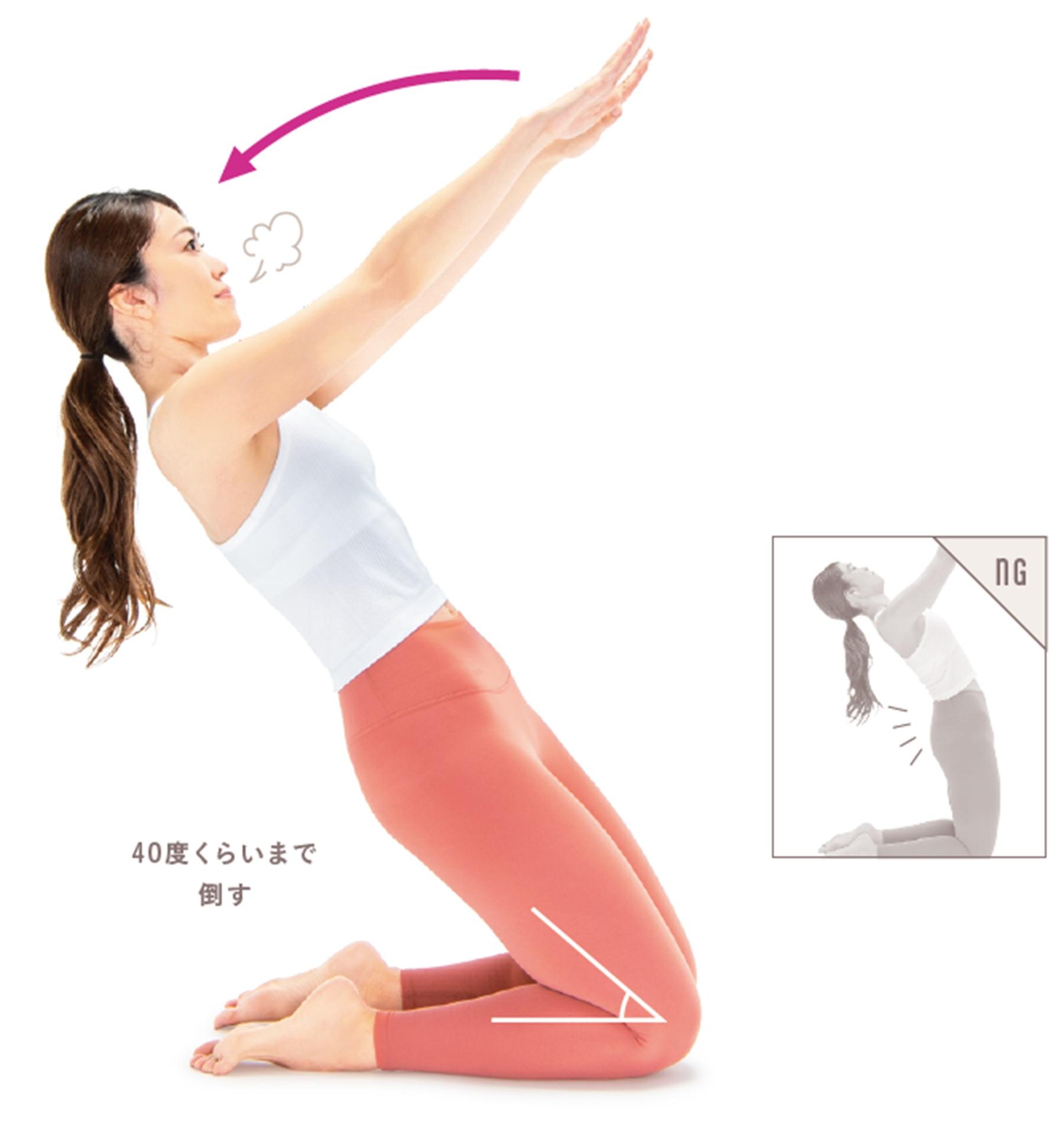 上半身を後ろに倒し、お腹の力で体を支えながら、自重を活かして大腿四頭筋をストレッチ。血流が促され、前もものハリがすっきりし、引き締め感もアップする。
