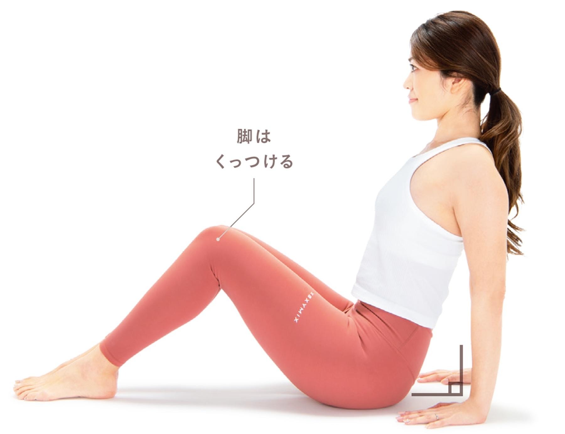1、床に座って、脚をぴったりくっつけた状態で両膝を立てる。指先をお尻側に向けて、肩の真下に手首を置く。この姿勢で上半身をしっかりと安定させる。