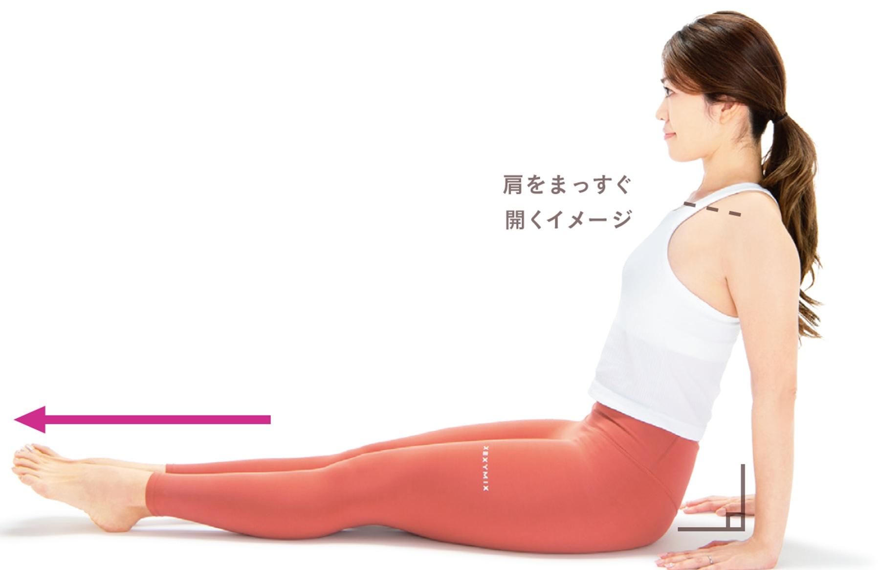 2、上半身を動かさないようにしながら、脚を股関節からつま先までまっすぐ伸ばす。手のひらで床を押し、肩のラインが一直線になるようなイメージで胸を開く。