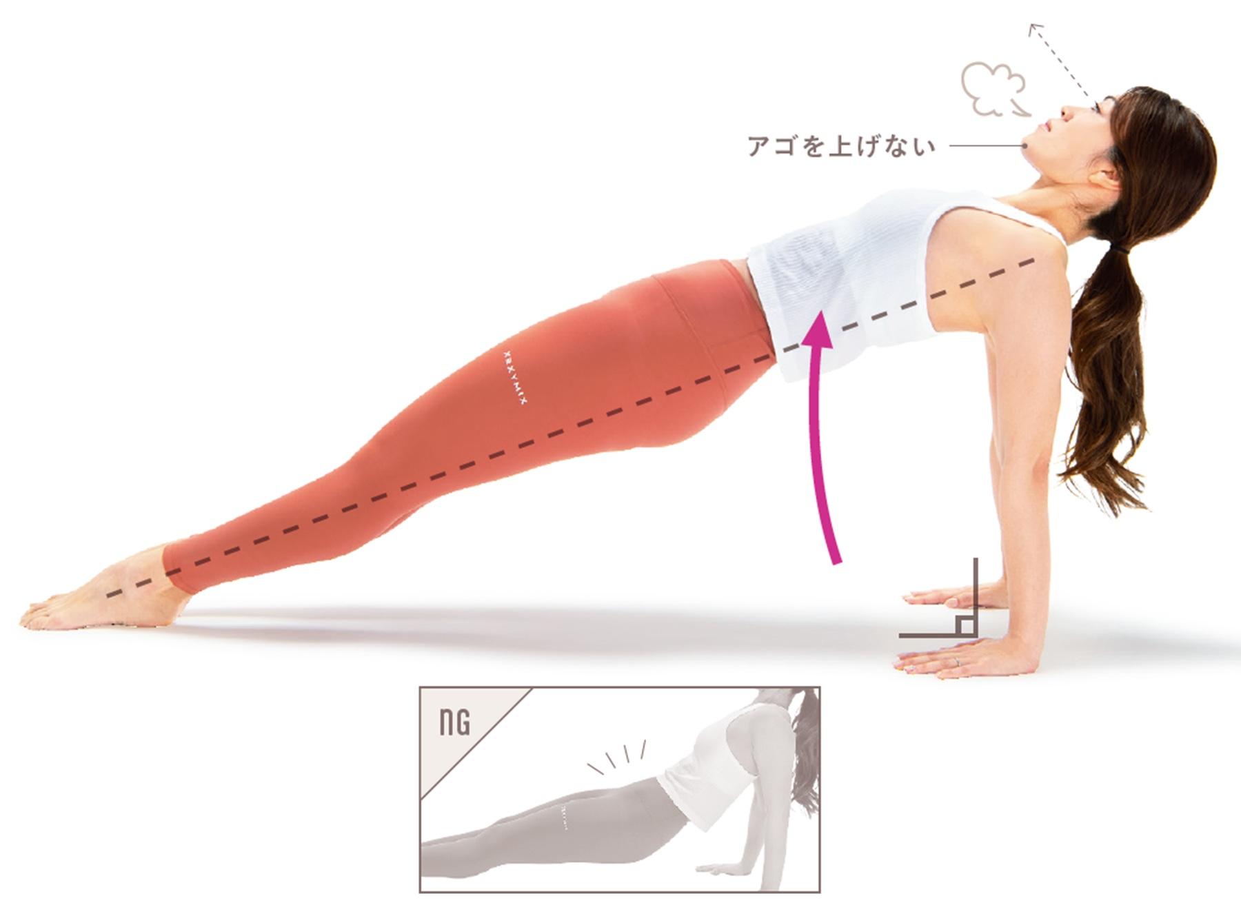 お尻に力が入っておらず、上げた時の高さが足りない。これでは腕に体重が乗ってしまい、お尻にしっかり刺激を入れることができない。お尻の力でアップ!