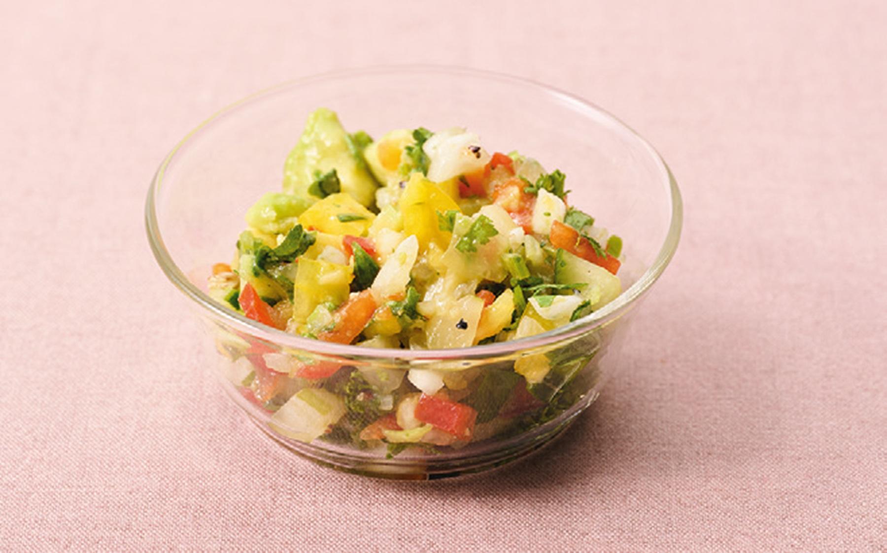 きゅうり…1本、玉ねぎ…1個、パプリカ(赤・黄)…合わせて1個分、セロリ…1本、大葉…10枚、アボカド…1個、青唐辛子…お好みで、レモン汁…大さじ3、黒こしょう…少々
