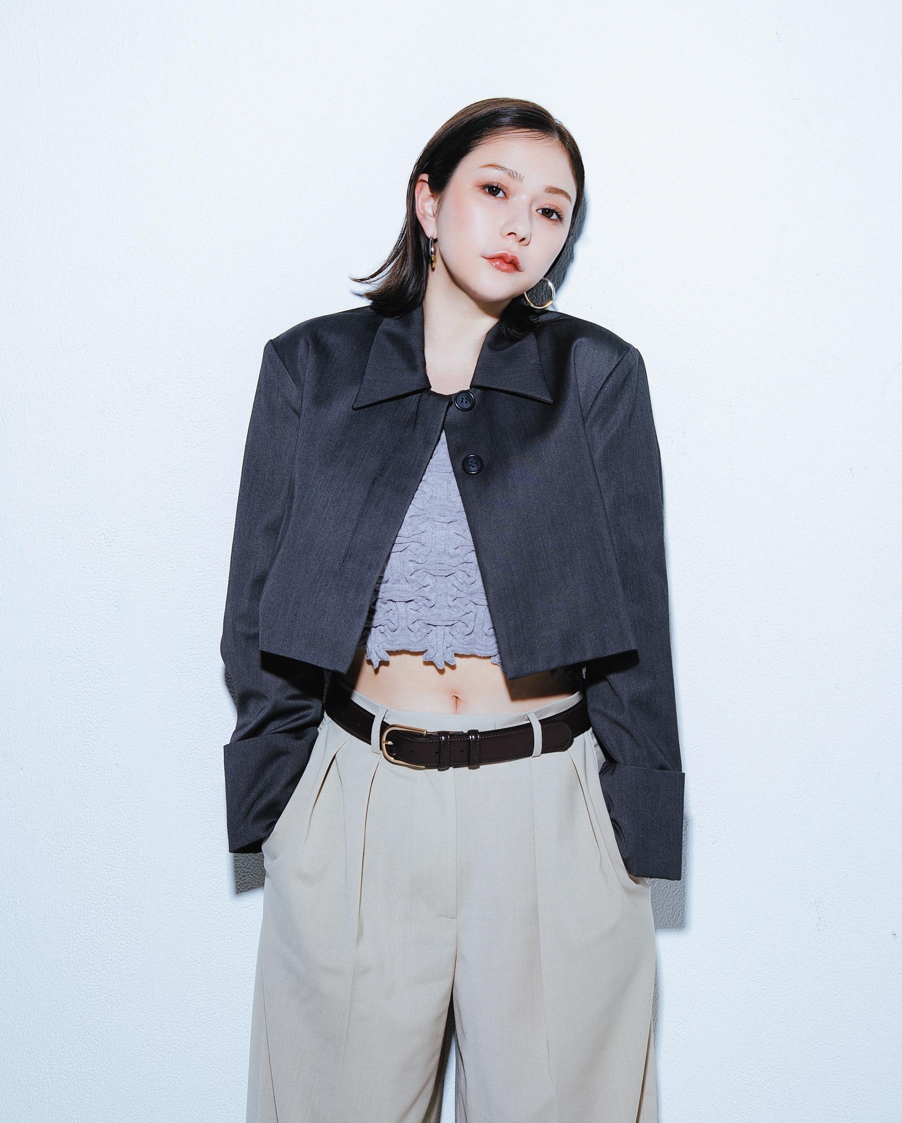 ジャケット¥19,800(シールームリン TEL. 03-6804-6844) ニットキャミ¥28,600() スラックス¥25,960 ピアス¥17,400(共にオル/ハナ ショールーム hana.showroom@hana-korea.com) ベルト¥4,333()