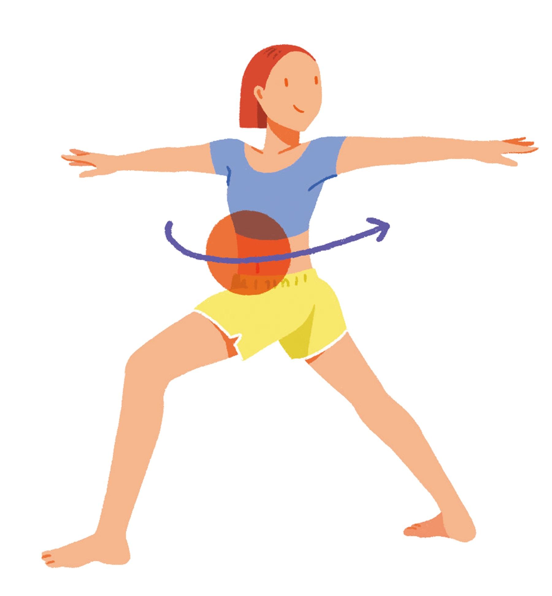 足を前後に大きく開き、手のひらを下に向けて両手を肩の位置に床と平行になるように上げる。そのままおなかを中心に上半身を左右にそれぞれ10秒ずつひねる。前後の足を入れ替えて同様に。