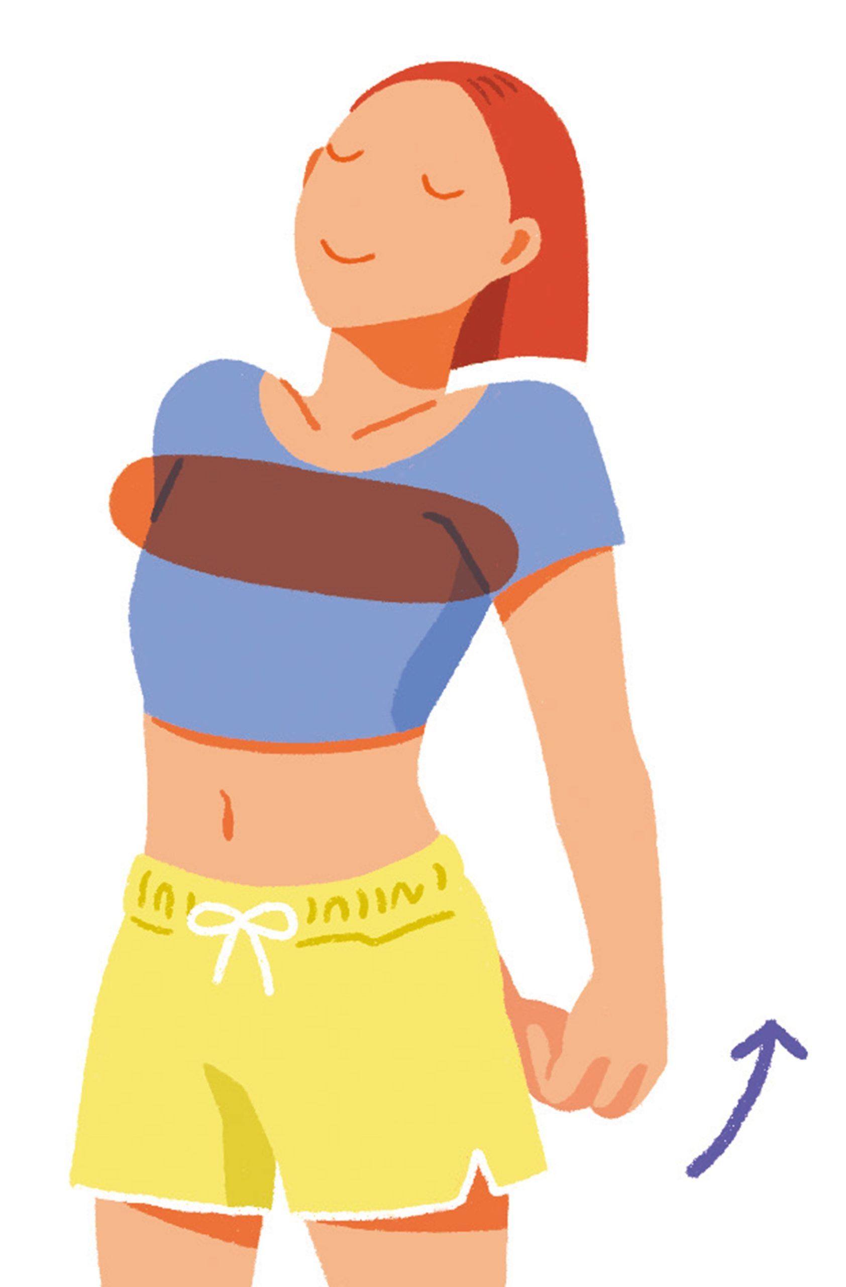 足を肩幅に開いて立ち、手を後ろで組む。左右の肩甲骨を寄せるように腕をゆっくり引き上げて胸を反らした状態で10秒キープ。この時、顔は自然と上を向くイメージで。