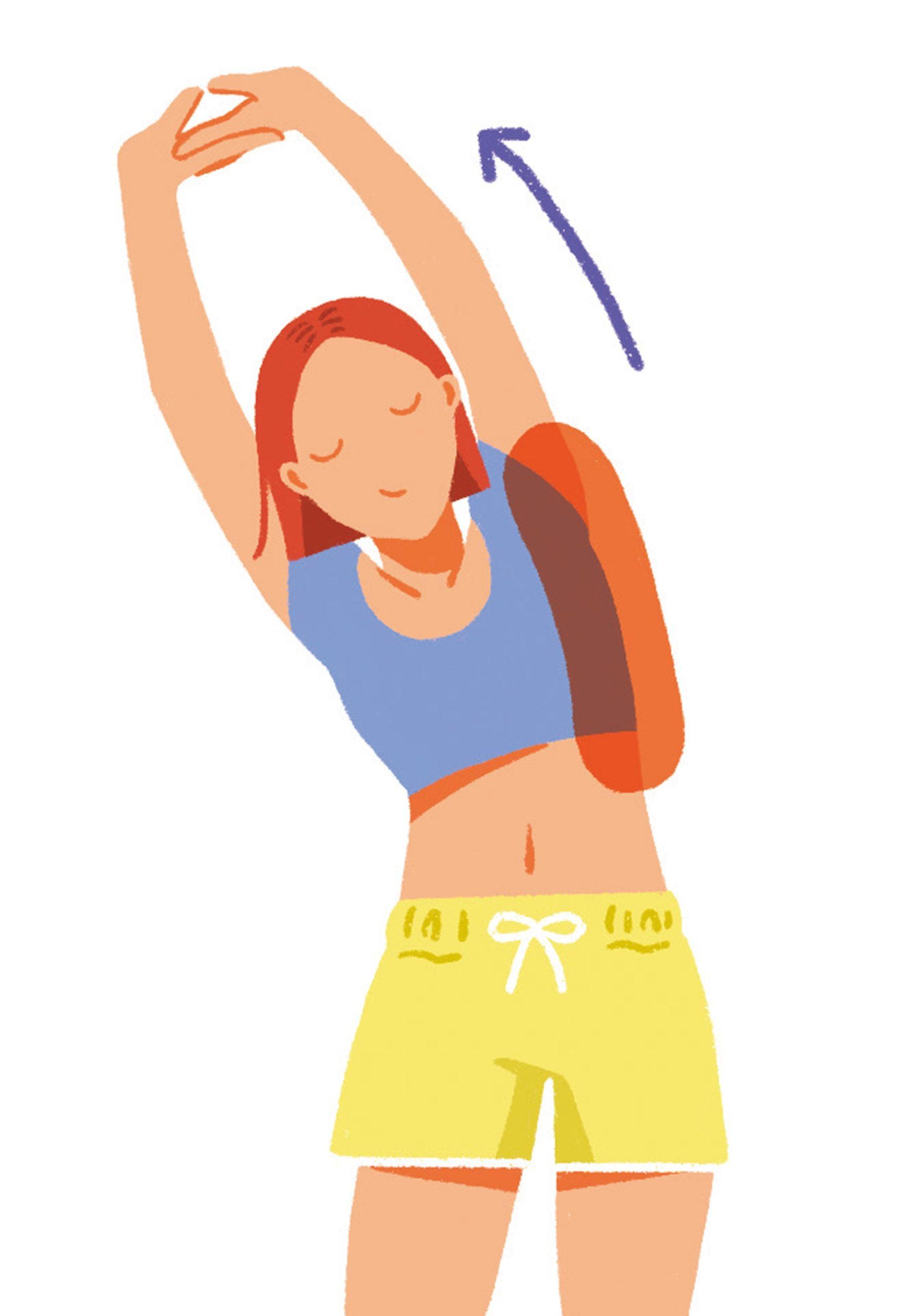 足を肩幅に開いてまっすぐ立ち、頭の上で手を組んだら、手のひらを返してできるだけ腕を伸ばす。そのまま上半身を真横に倒し、腰から腋を伸ばして10秒キープ。反対側も同様に。