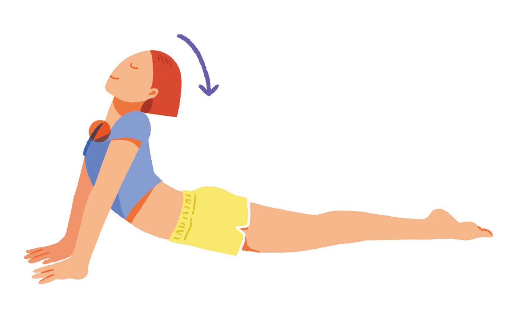 うつ伏せになったら、胸の横に両手をつく。両手のひらで床を押しながら上半身を起こし、頭をお尻に近づけるように反らす。そのまま10秒間キープし、ゆっくり元に戻す。