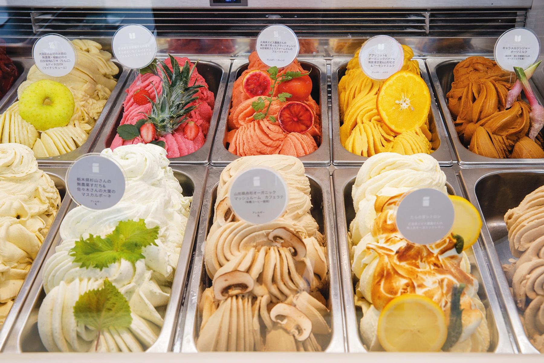 オーナーは、日本一のジェラート職人を決める大会で優勝経験もある大澤英里子さん。肌荒れに悩んでいた時期に、地元の宮城・鳴子温泉の野菜を意識して摂るようになって回復したのを機に、野菜の力を広めたいと思ったのだそう。ジェラートの主役は、全国各地から取り寄せた旬のオーガニック野菜たち。マッシュルームとカフェラテ、たらの芽とレモンなど、その時期だけのユニークな組み合わせに出合えるはず。表参道の一角にある店にはなんと小さな畑が! そこからダイレクトに工房へ運ばれる野菜やハーブは鮮度抜群。イートインスペースでは、日本酒やワインなども提供。ジェラートトリプル¥1,400。
