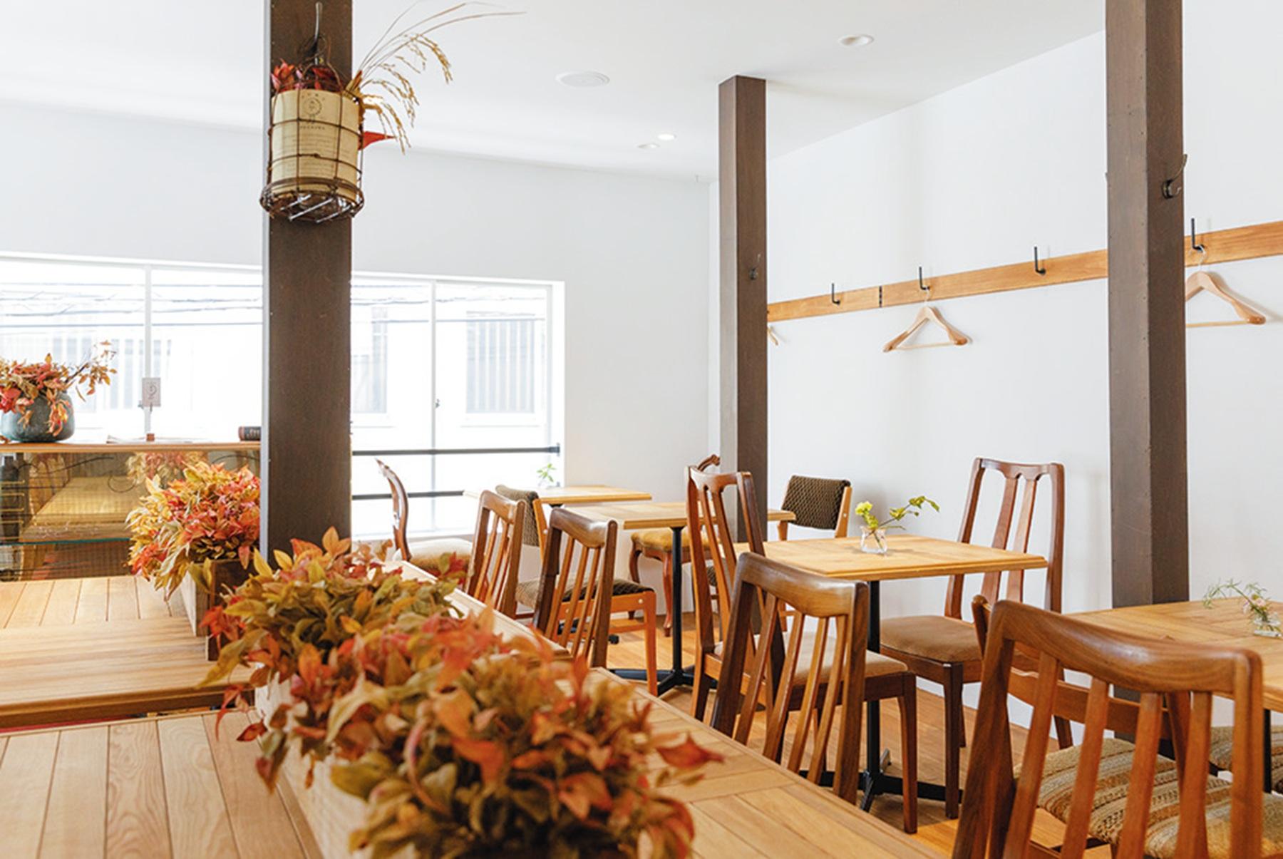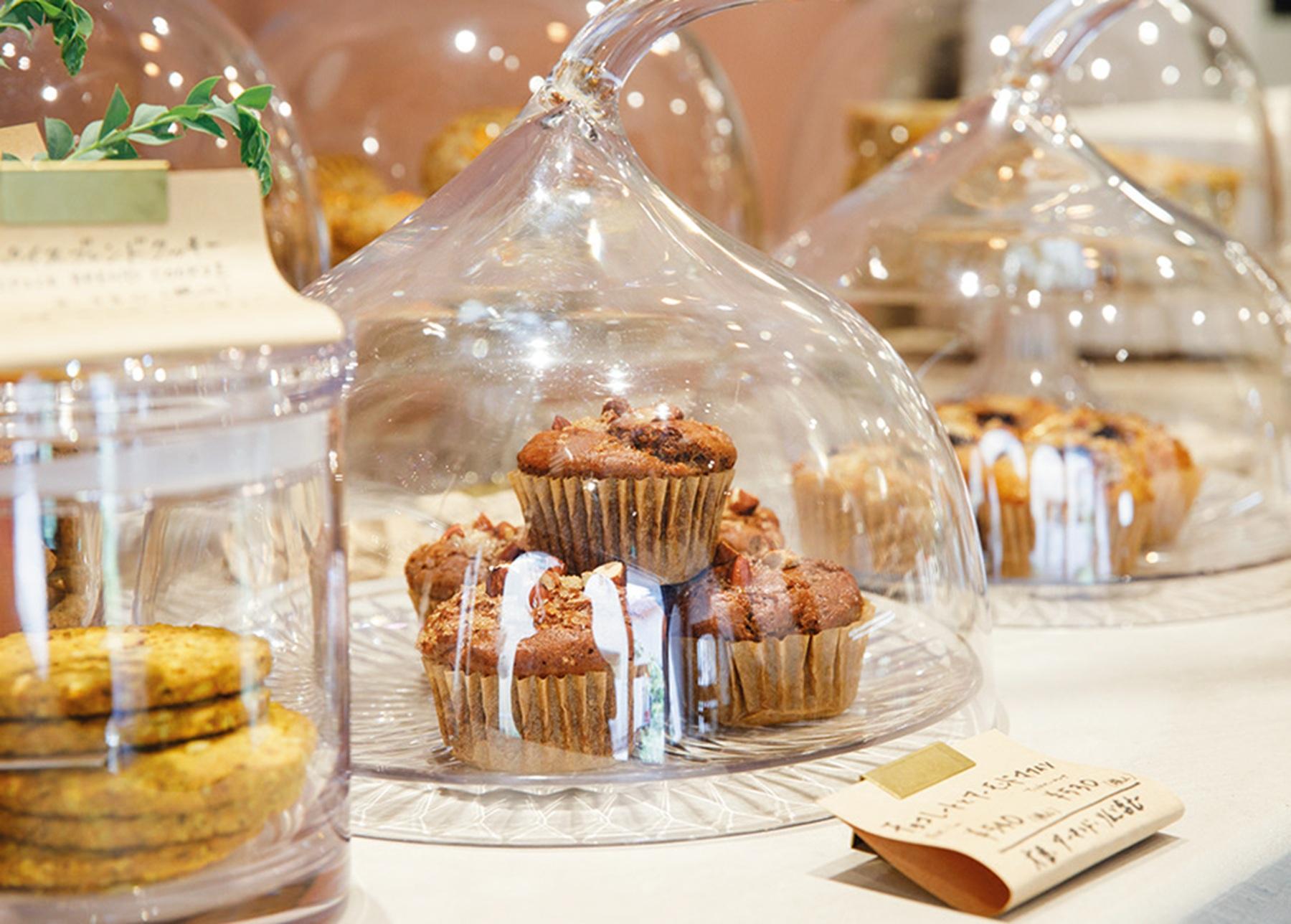 店に入ると、ヴィーガン&グルテンフリーのクッキーやマフィン、ケーキがお出迎え。四万十川源流で育ったお米、JAS認証のオートミールやアガベシロップなど素材にはとことんこだわる。実は、スタッフの約半数はヴィーガンではないそう。「だからこそ、ヴィーガンの勉強はしていますが、“ちゃんと美味しい”ことを追求しています」と店長。もっちりした米粉のベーグルかブレッドを選べるブランチプレートデリ4種(¥1,600)は、素材の味を活かしながらスパイスを巧みに使い、4種類の中で味の強弱をつけることで、野菜だけでも十分満足感のある一皿に。“実り”をテーマにした店内も木の什器が温かみを醸し出し、居心地がいい。
