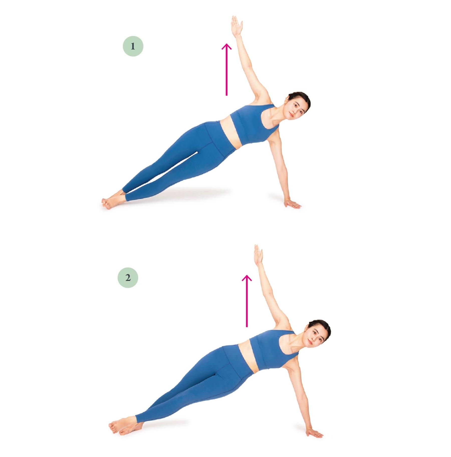 2、左ひじと左脚で体を支えながらお尻を上げ、右腕を上に伸ばしてバランスをとる。右足のつま先で円を描くようにゆっくり左回り右回り3回ずつまわす。反対側も同様に。