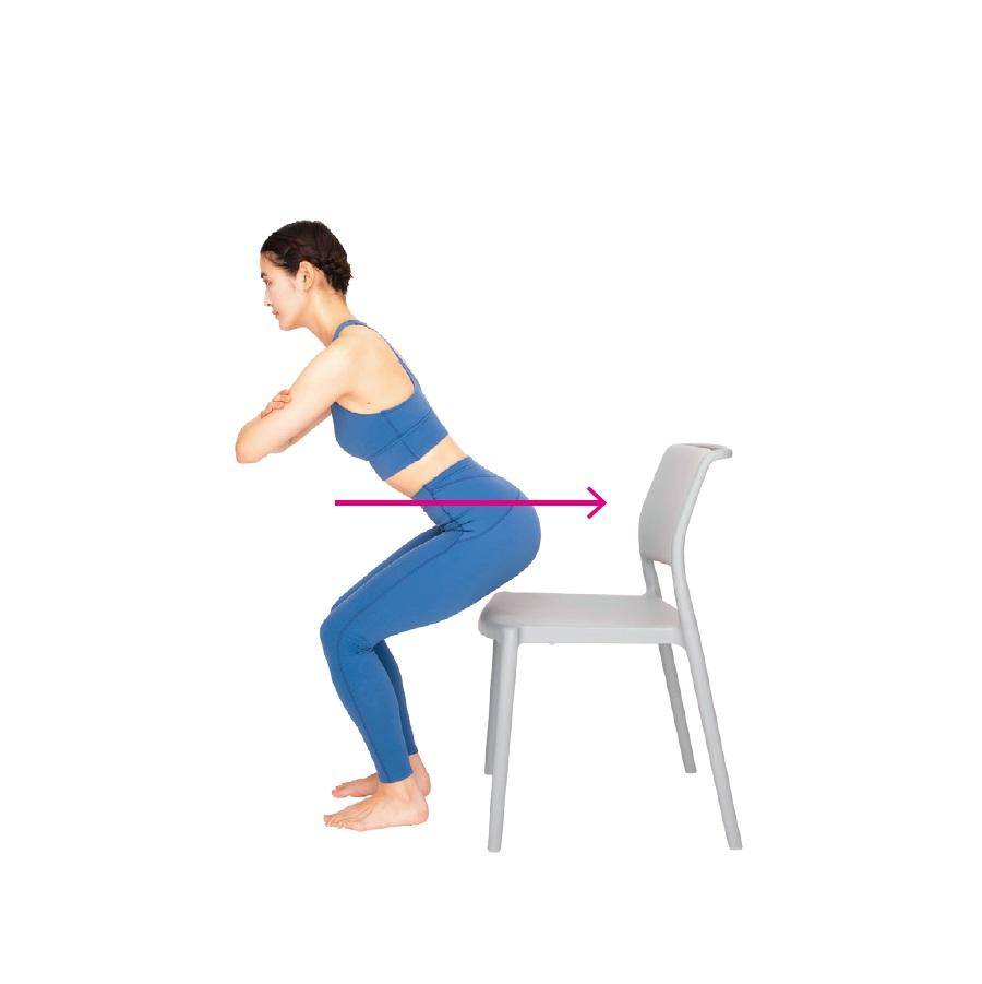 2、骨盤を前傾させながらゆっくりひざを曲げていき、お尻を突き出すようにして椅子に座る。