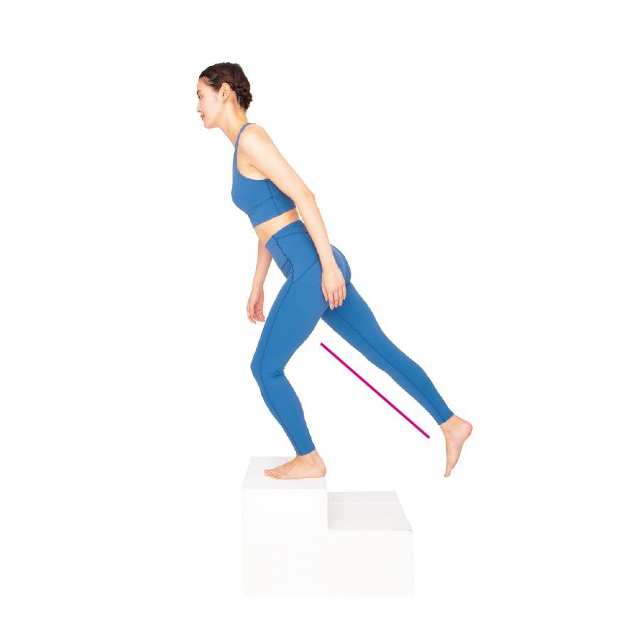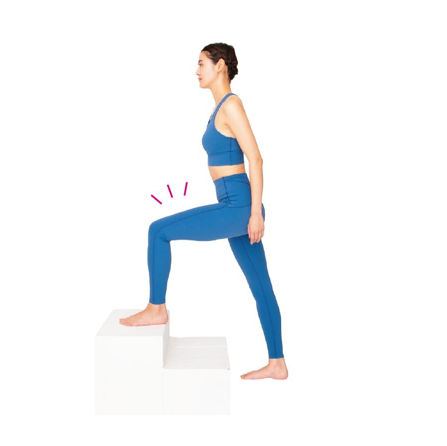 高い段差に足をのせると股関節の屈曲筋群が強く働き、後ろの足で階段を蹴ると伸展筋群が強化。通常の階段上りより、股関節の可動域がUP。1フロア分だけでもやってみよう。
