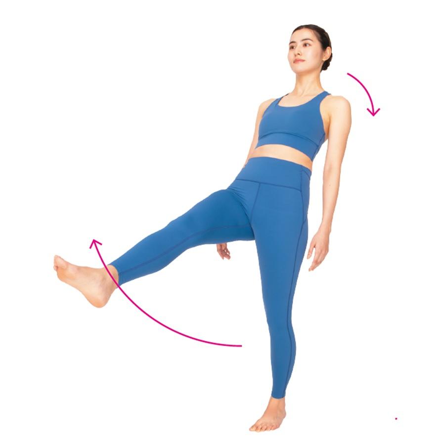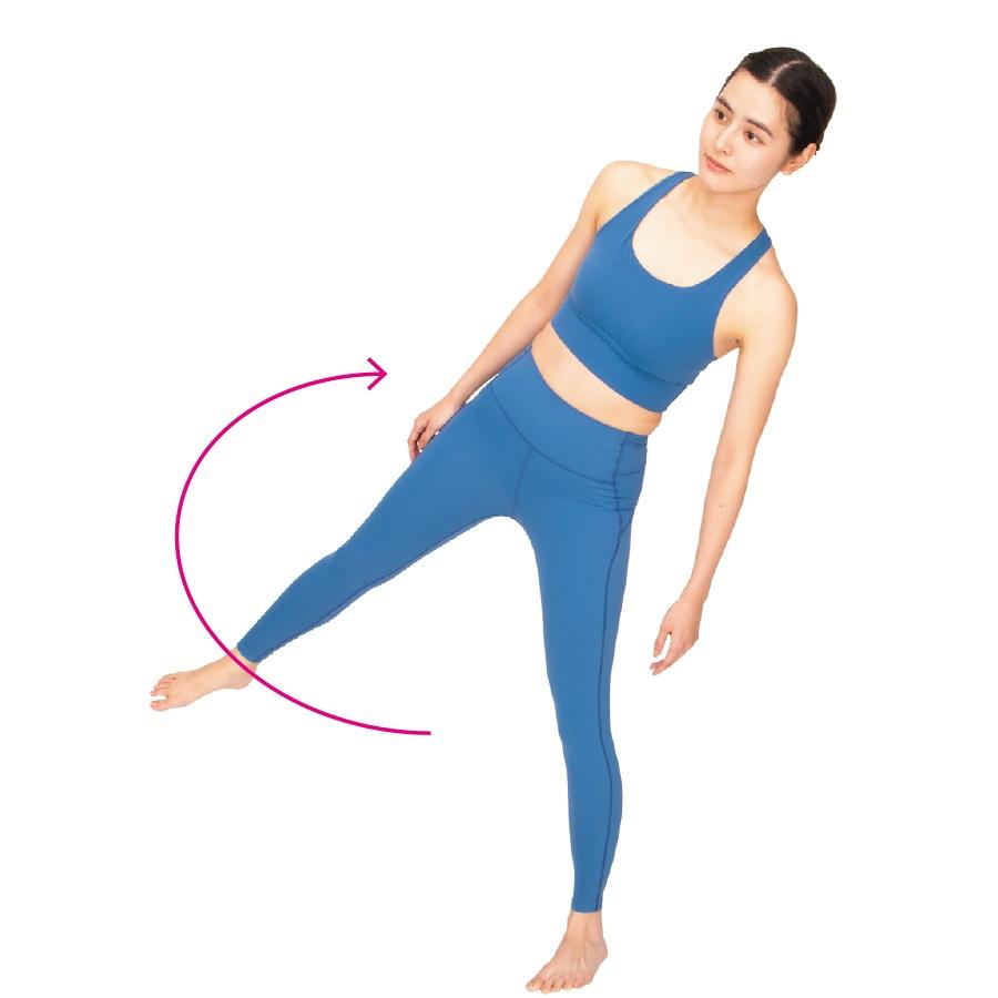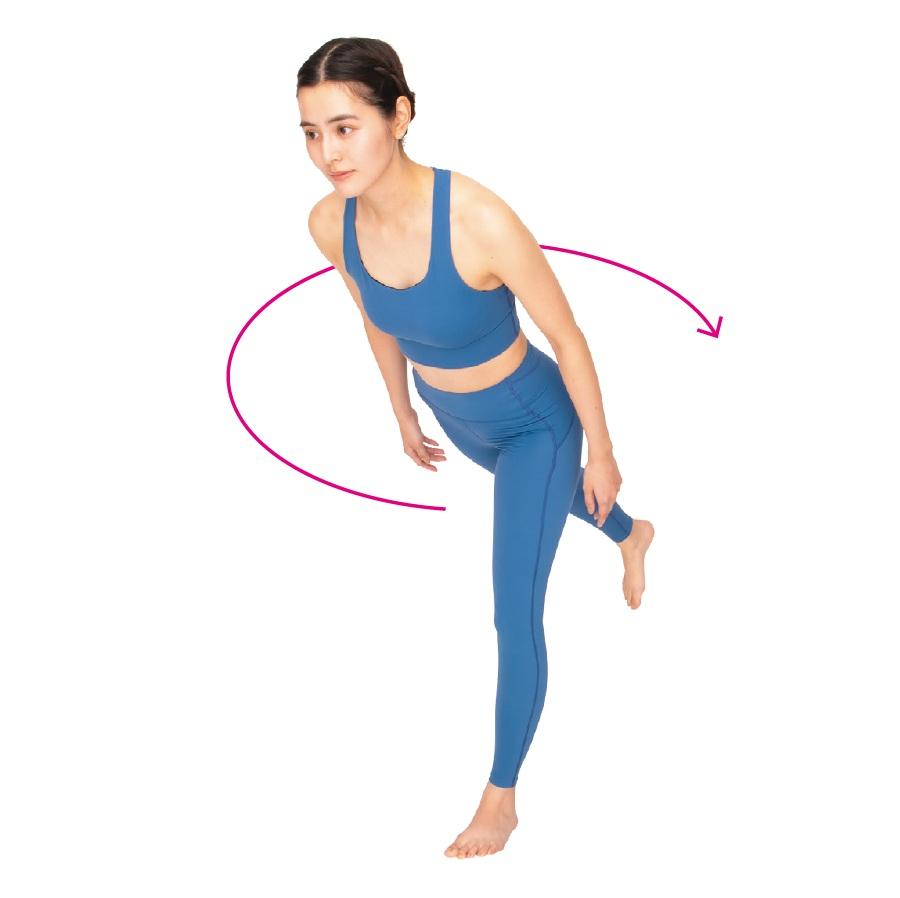 片足立ちで前後左右に体を傾けることで、股関節が6方向に連動し、周囲の筋肉も活性化。骨盤の左右差や傾きの修正にも。最初は小さな動きで、電車待ちなど隙間時間にトライ。