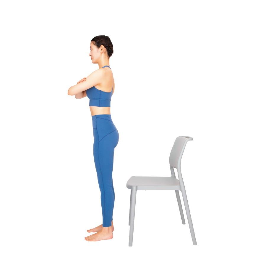 1、椅子の前に立ち、両腕を胸の前で組むか普通に下ろす。
