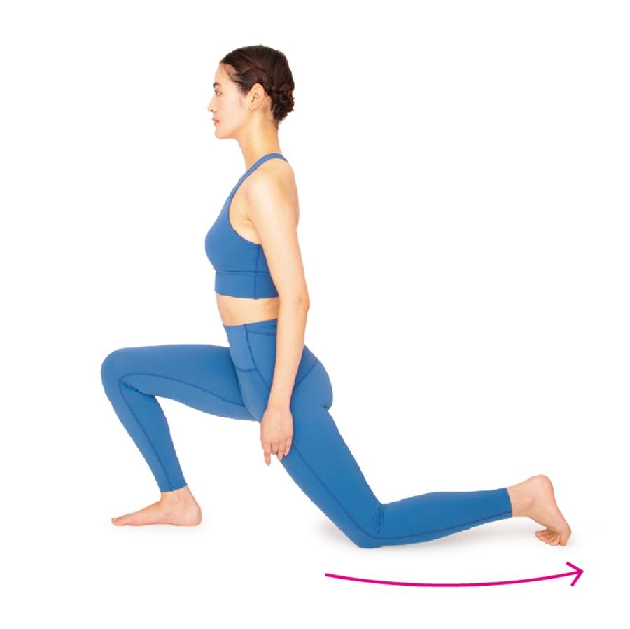 屈曲筋群と伸展筋群が同時にほぐされて骨盤のゆがみも整い、美脚と美尻効果も。腕を上げて体側を伸ばす動きを加えると腹横筋などがストレッチされ、ウエストの引き締めにも。