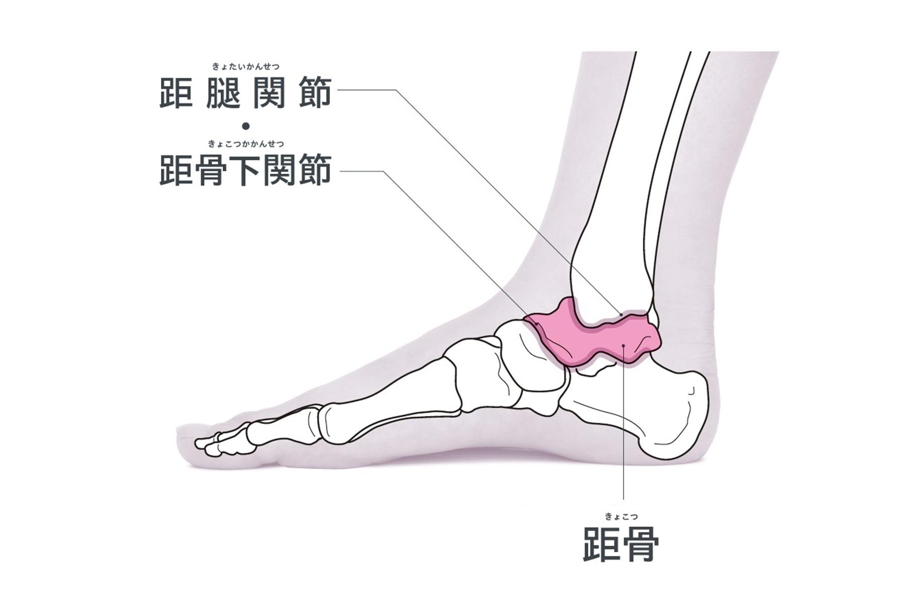 距腿関節は距骨の上部に接する関節。足首を曲げてつま先を上げる「背屈」や、つま先を下げる「底屈」の動きに関与する。距骨の下部に接する距骨下関節は、足をひねる動きやバランスを担い、足を内側に倒す動き「回内」や足を外側に倒す「回外」に関わる。この2つの関節が連動して、足の複雑な動きを支えている。