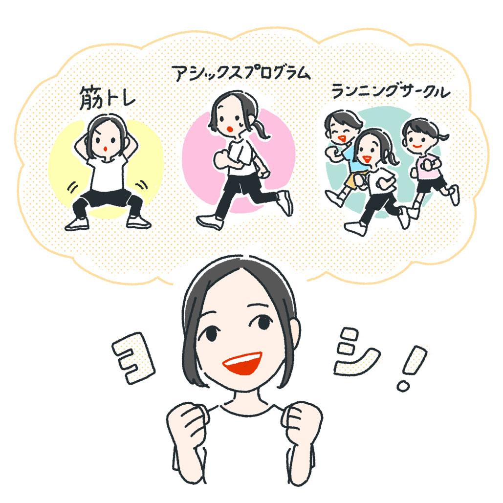 ゆかさんのトレーニングは、週2回のアシックスのプログラム、3つのランニングサークル、さらにはストレッチや筋トレと大充実!