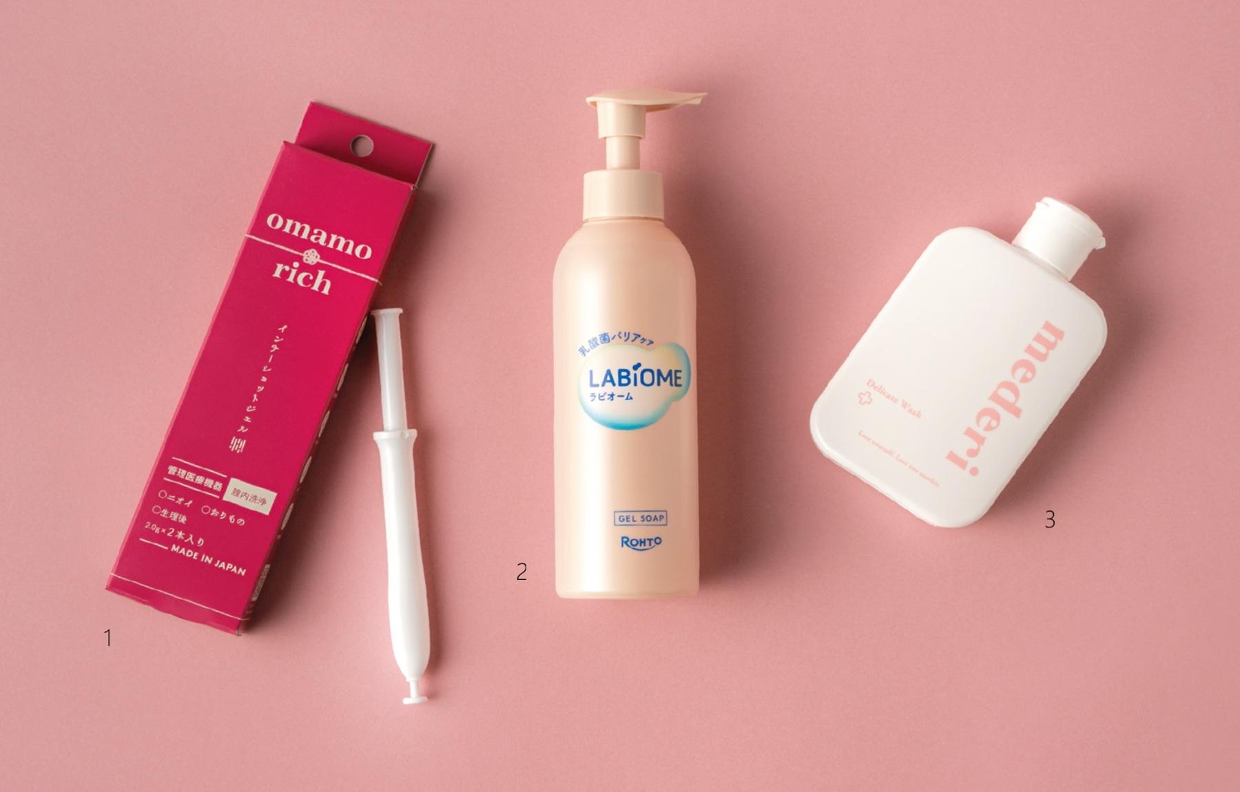 写真左から、① omamorich「インナーショットジェル」、② ロート製薬「ラビオーム バリアビオソープ」、③ mederi「デリケートウォッシュ」