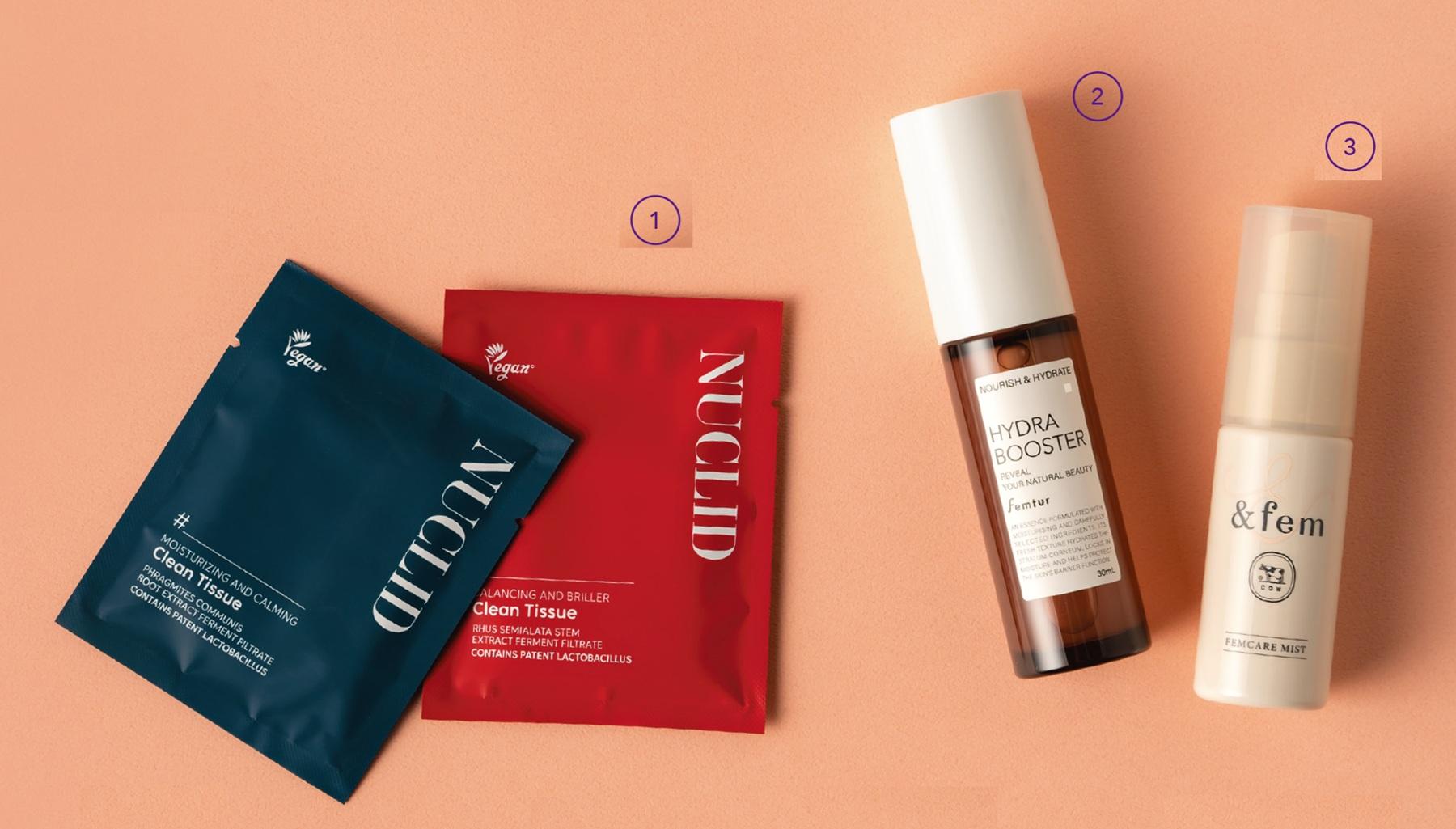 写真左から、① NUCLID「ニュークリッドクリーンティッシュ」、② アンファー「フェムチャー ハイドラブースター」、③ 牛乳石鹼共進社「アンドフェム フェムケアミスト」
