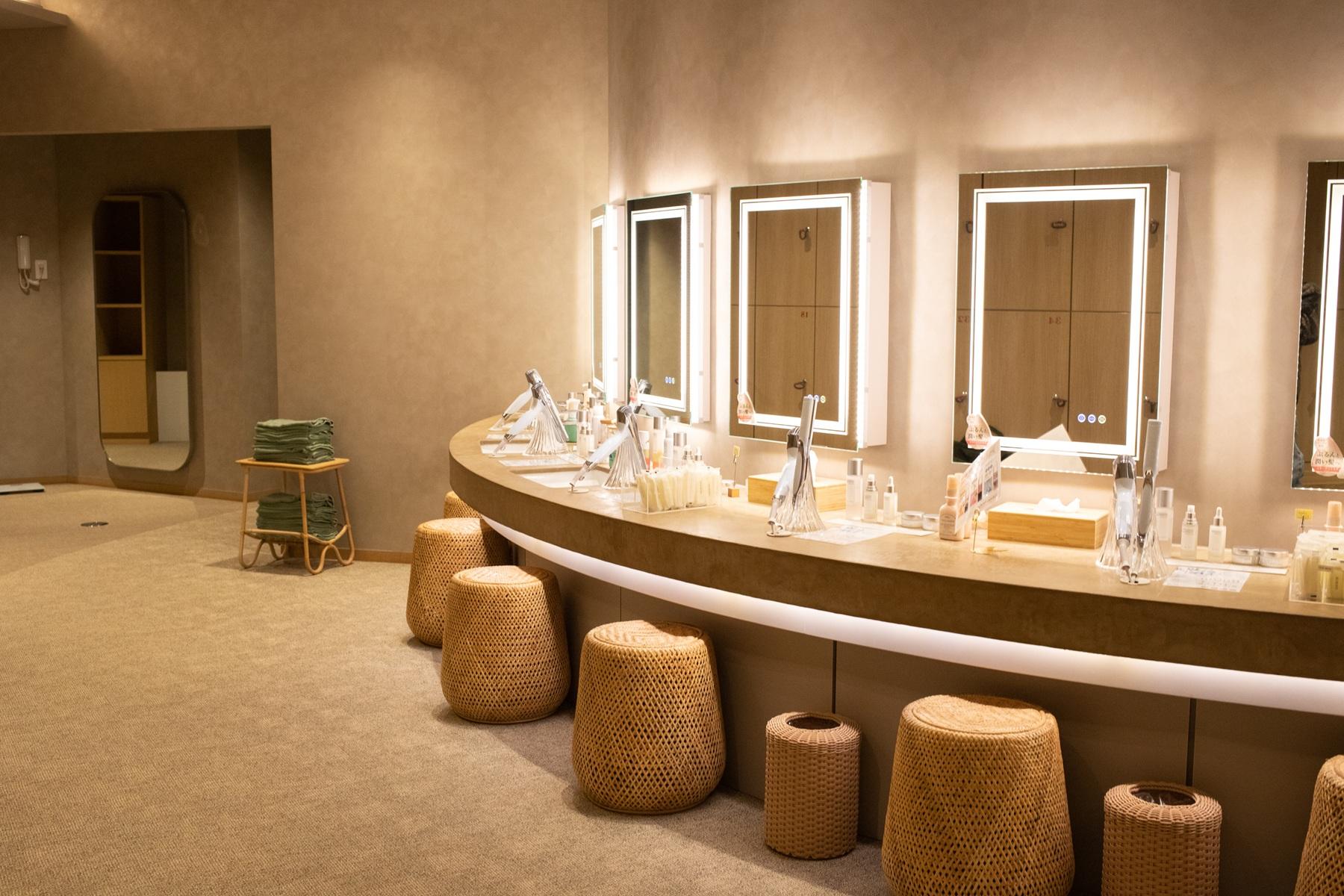 パウダー&ロッカーエリア スキンケアアイテムや着替えを広げられるスペース設計。提供コスメは、俳優のMEGUMIさんがセレクト。ロッカー代は入浴料に含まれているので、何度でも開け閉め可能。