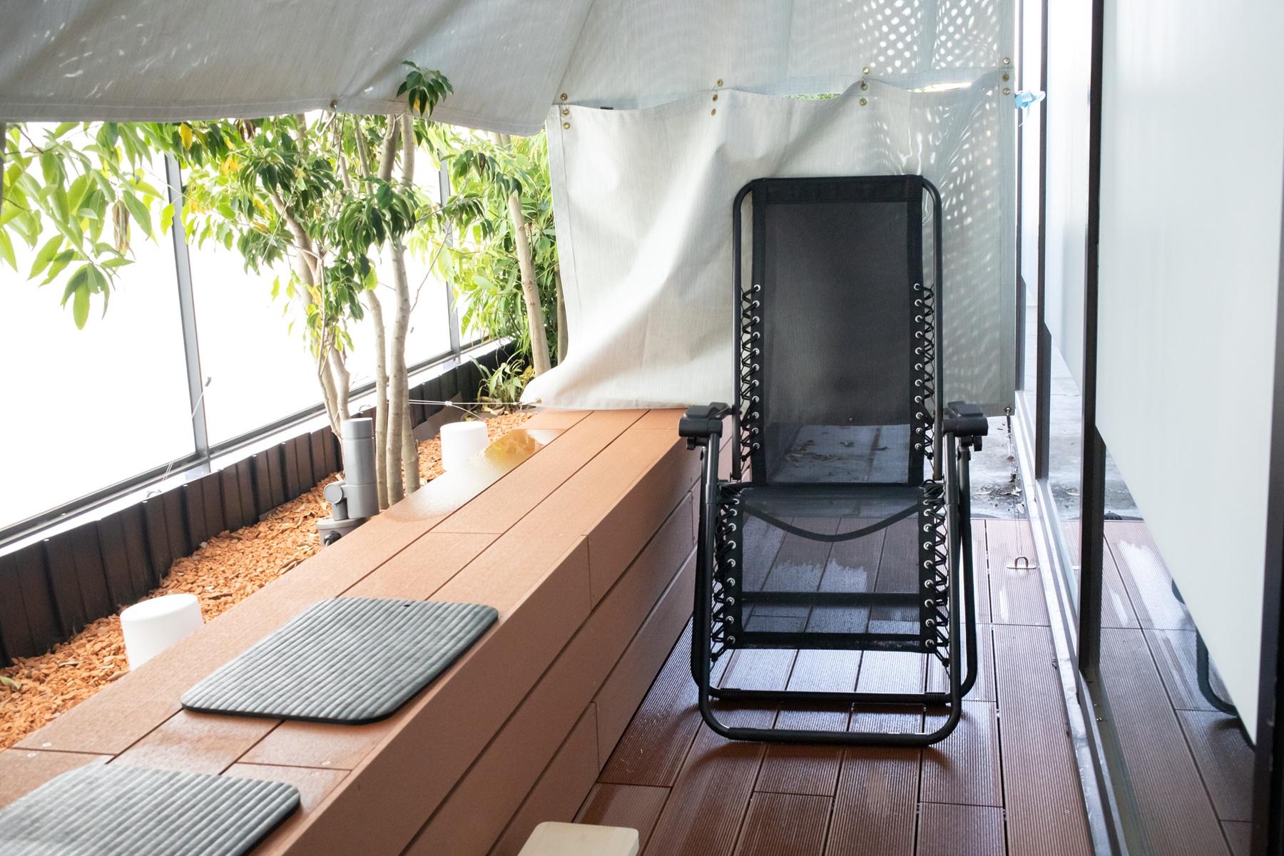 隠れ家的な外気ラウンジ 7月のリニューアルを機に外気浴エリアを拡大。都会のど真ん中にいながら、外から入り込む新鮮な空気と自然の音で心身ともに存分にリラックスできる。