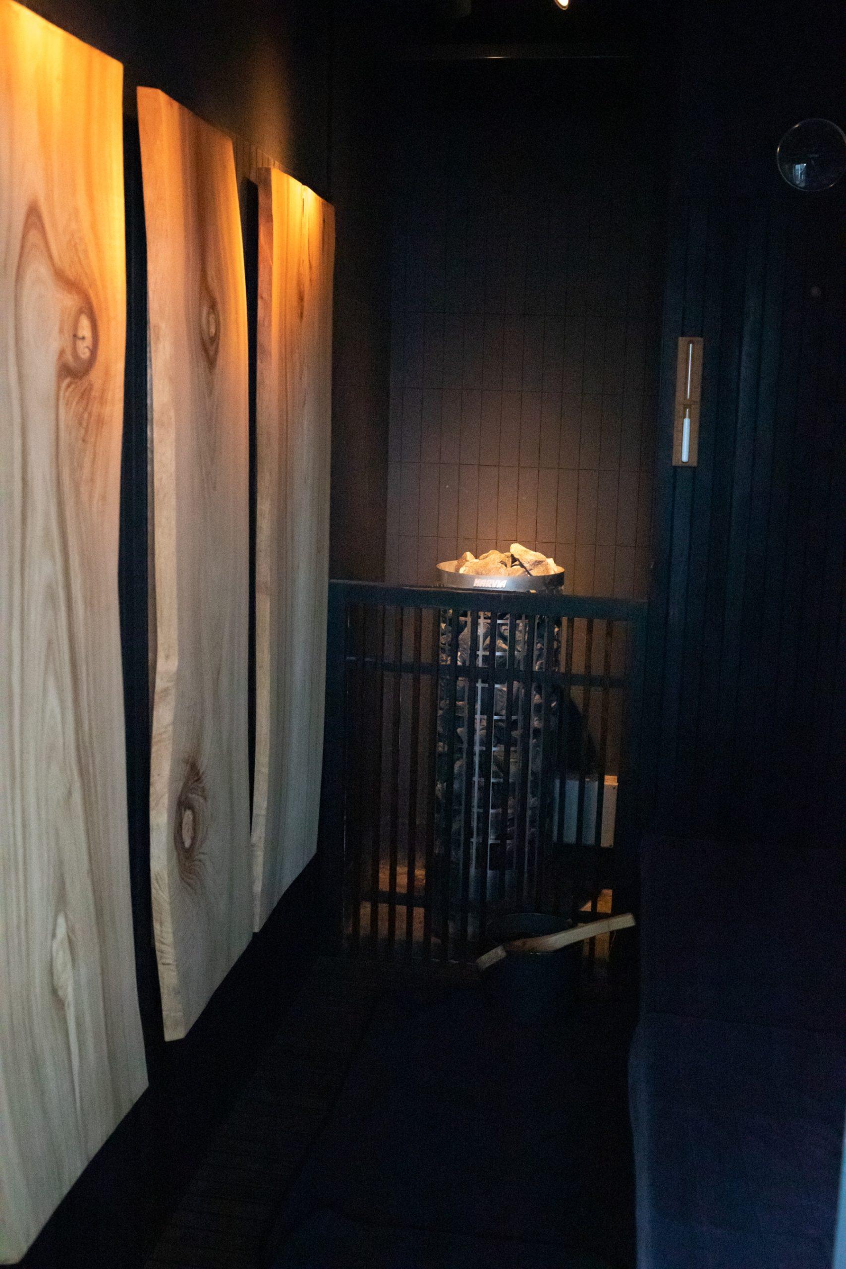 香り豊かなサウナ 壁面に設置された香木から、甘美で落ち着く香りが立ち込めるサウナ「かおるこ」。8人ほどが入れるサイズ感。セルフロウリュの体験もでき、しっかりと汗をかける。