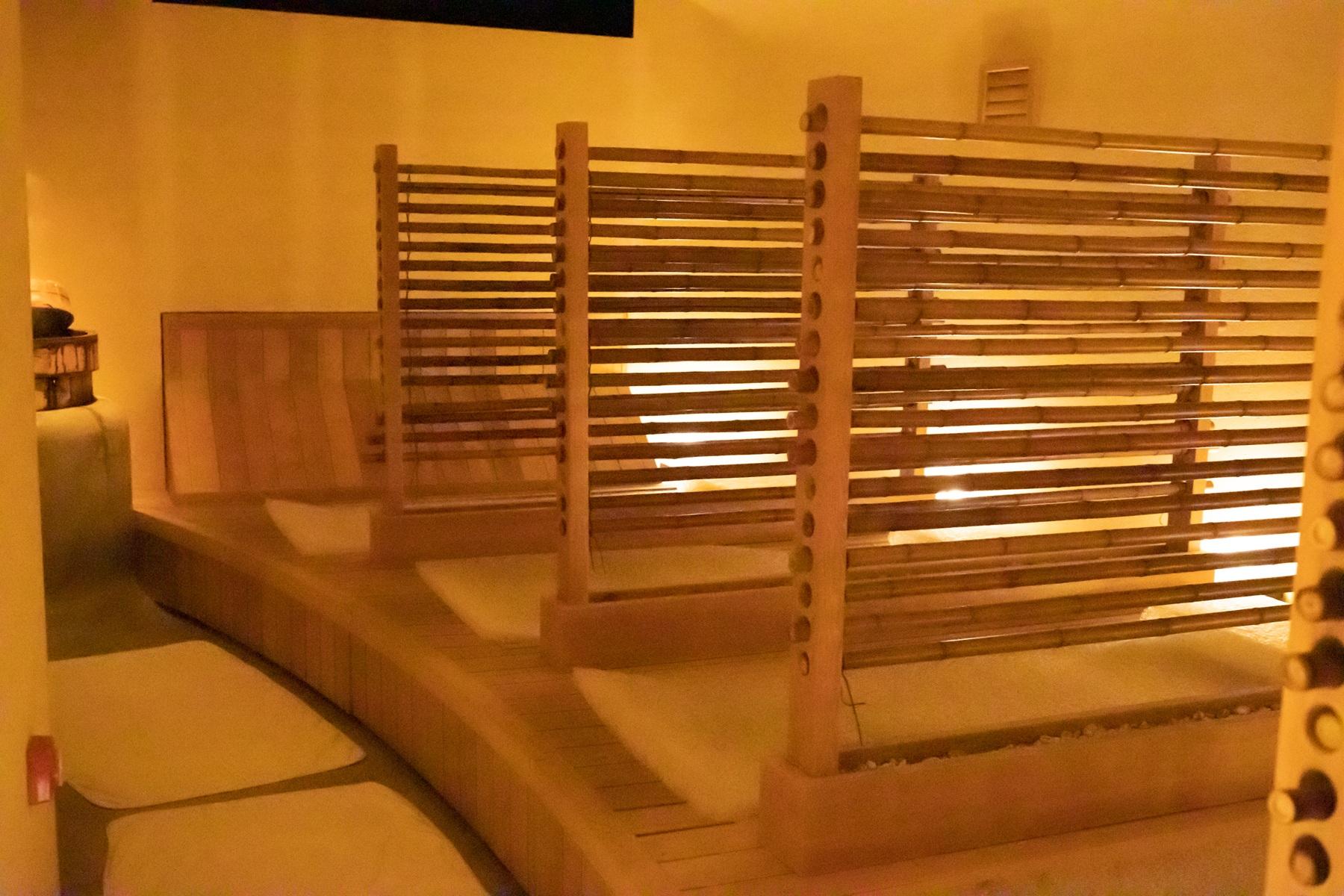木の温もりも漂う蒸し湯 脳と睡眠を科学する「ブレインスリープ」製のマットレスと枕が導入された蒸し湯。背中や後頭部からも、生薬の「石菖(せきしょう)」の蒸気が湧き立つ最高のデトックス体験を。