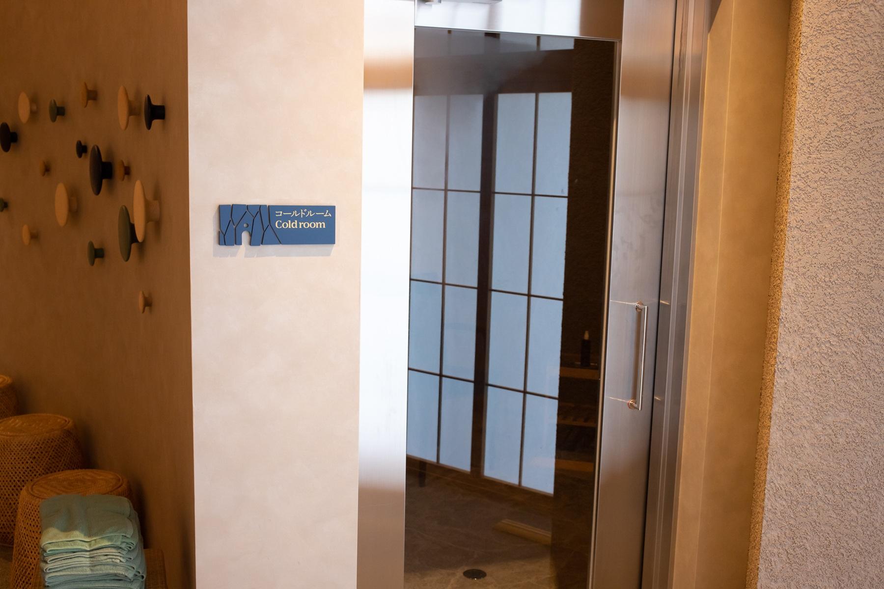 火照った体をクールダウン 室温が10°Cほどに設定されたクールダウン用のスペース。発汗後に乾燥しがちな肌のケア用品として『OSAJI』の保湿アイテムが。体と心を徐々に日常モードに戻していく。