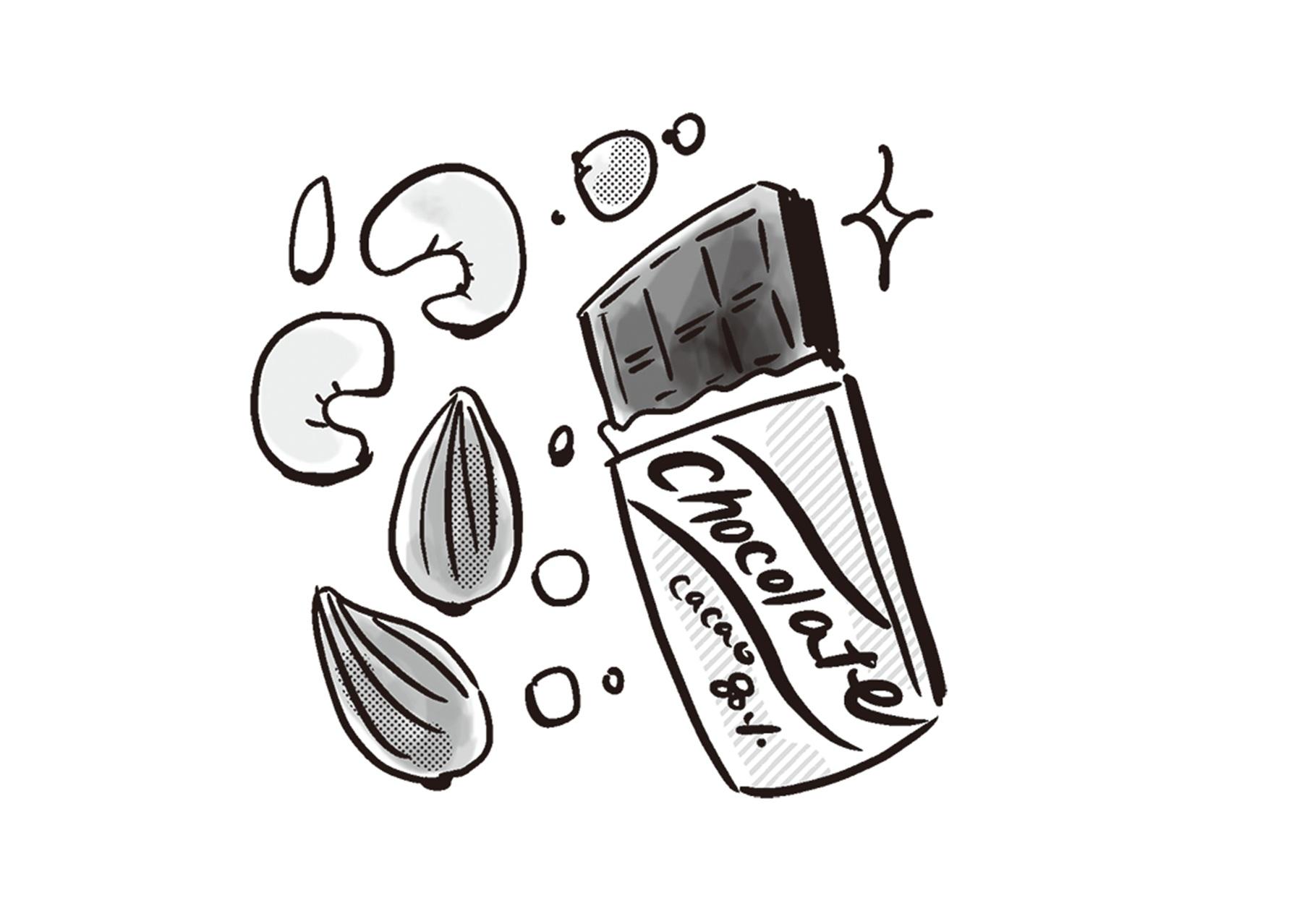 「どちらもオイルリッチなおやつなので、バッグに忍ばせておくとよいでしょう」。ナッツはクルミ、アーモンド、ヘーゼルナッツ。チョコならカカオ分70%以上で、甘味料が人工甘味料のものがよい。