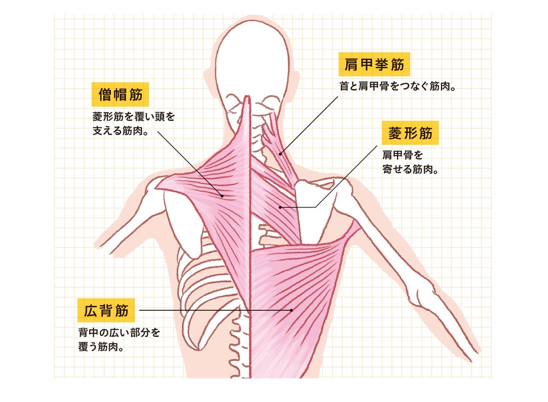 肩甲骨を引き寄せる働きがあるのが、菱形筋。ここが弱いと、胸を張ることができず猫背が悪化する。菱形筋を覆うように広がっている僧帽筋が収縮しないと、頭をまっすぐ支えられなくて、首が前に出てしまう。首と肩甲骨をつなぐ肩甲挙筋には、肩甲骨を持ち上げる働きがあり、ここも日頃からほぐしておきたい筋肉。広背筋はワキから腰の後ろまで覆う筋肉で、固まっていると、肩を後ろに引っ張れず、巻き肩になっていく。