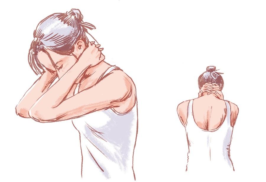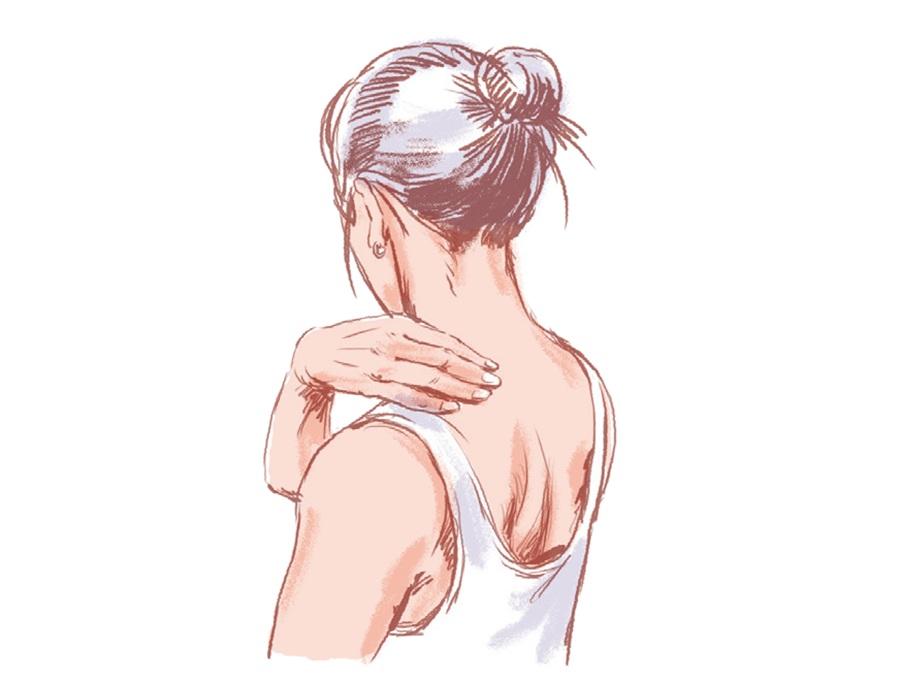 簡単なエクササイズの前にやっておくと、動かしやすくなるマッサージをご紹介。首の後ろに溜まった脂肪を柔らかくして、血流を促そう。どれも、40秒間押さえるだけで、肩が下がるのが実感できるはず。
