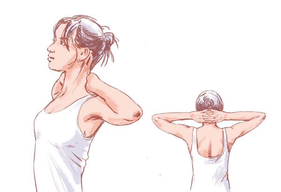 頭の後ろで両手を組み、肘に合わせて開く・寄せる動作を繰り返す。僧帽筋の上部の真ん中あたりが収縮し、肩甲骨まわりがほぐれて動かしやすくなる。その結果、内に入った肩が開き、丸まった背中もすっと伸びる。
