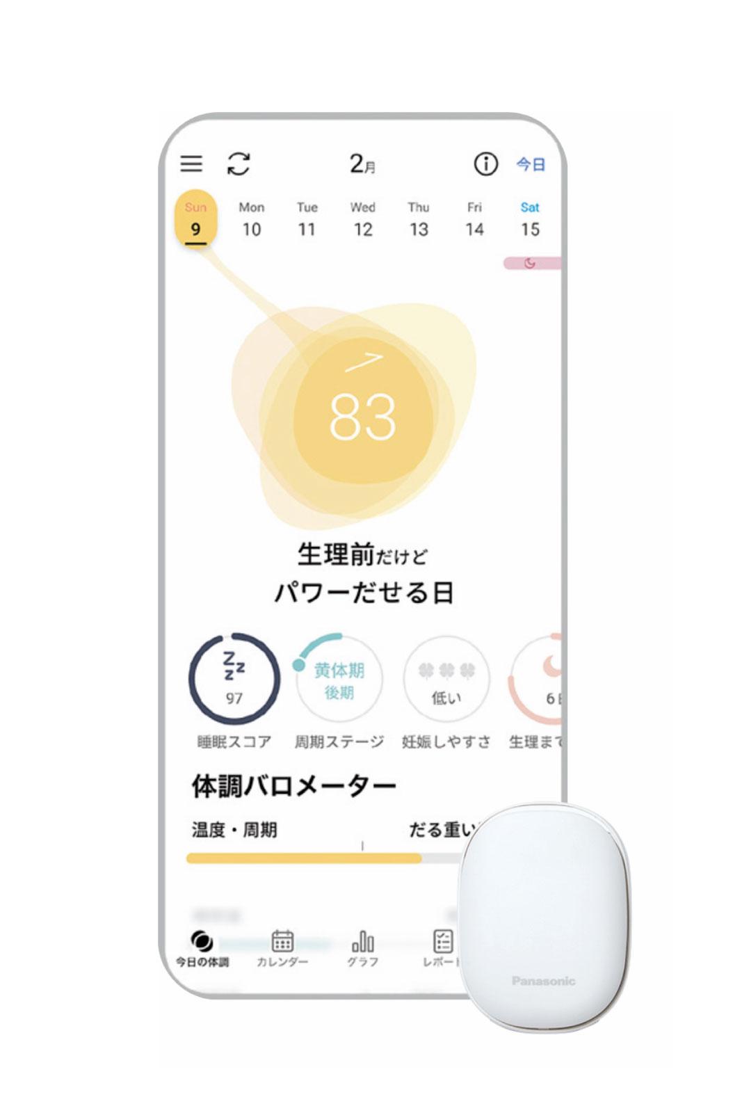 服のウエストに挟むなど、お腹に小型デバイスを装着して眠るだけで、温度変化と睡眠データを計測。起床後、デバイスからワンタッチでアプリに転送すれば、その日の体調や生活習慣のアドバイスがもらえる。生理予定日や不調の傾向を事前に把握できるのも便利。追加料金なしで看護師や薬剤師などの専門家にオンライン相談ができるのも心強い。初期契約 ¥5,500、契約月の2か月後以降 月額¥500(パナソニック TEL. 0120-872-086)