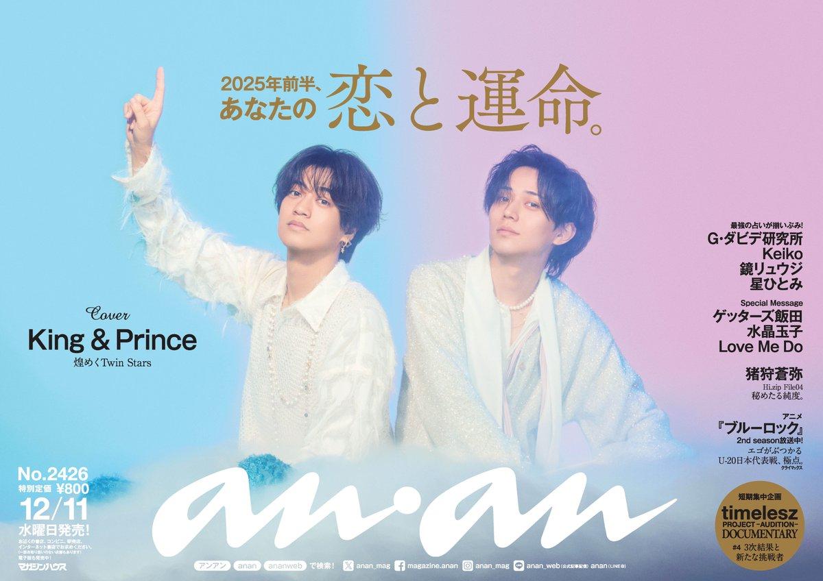 anan恒例、人気の占いが勢ぞろいする「恋と運命」特集の最新版。2025年の運勢を指南します。その表紙に、anan発売当日に、ニューアルバム『Re:ERA』をリリースするKing & Princeが登場します。